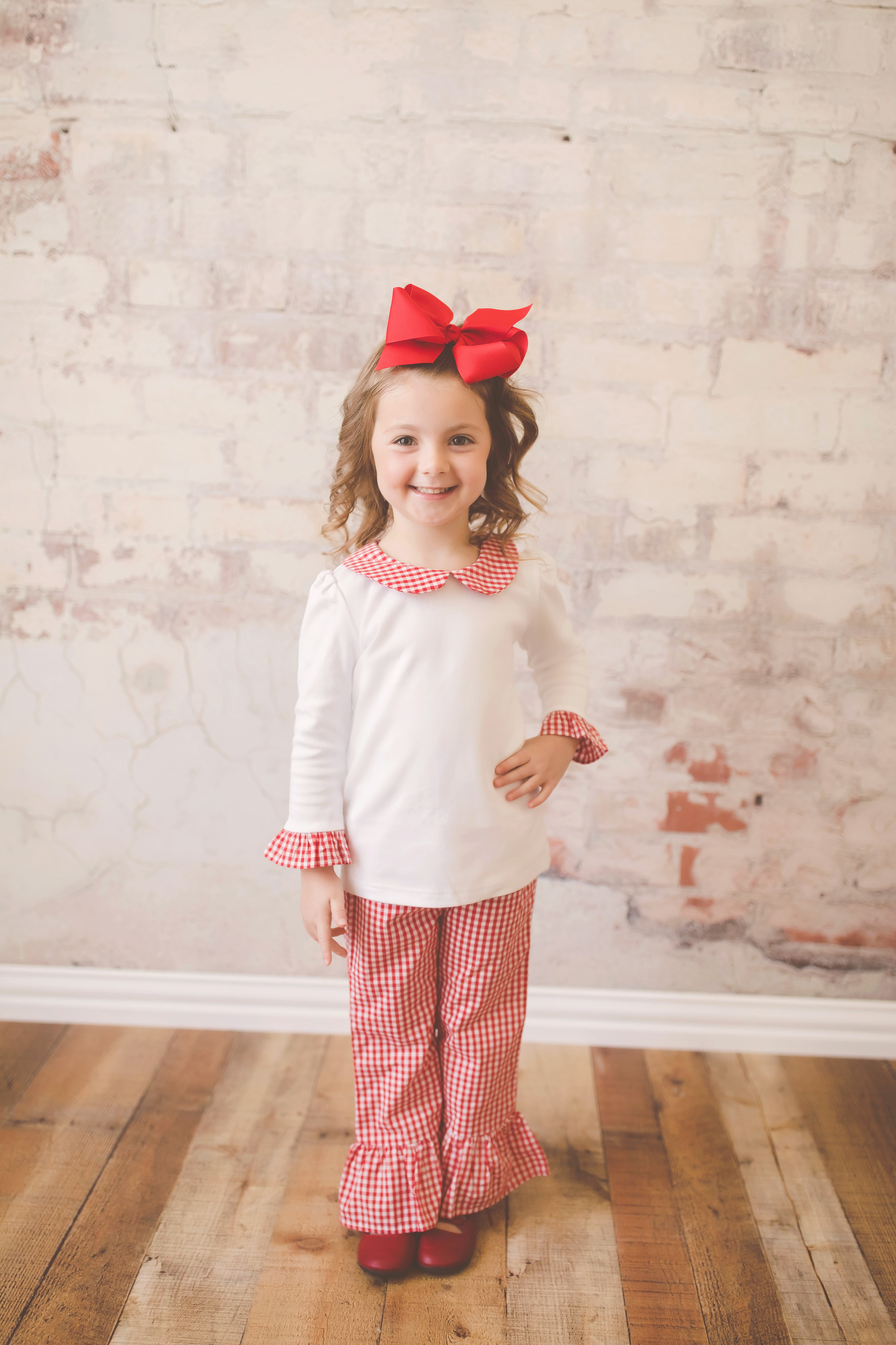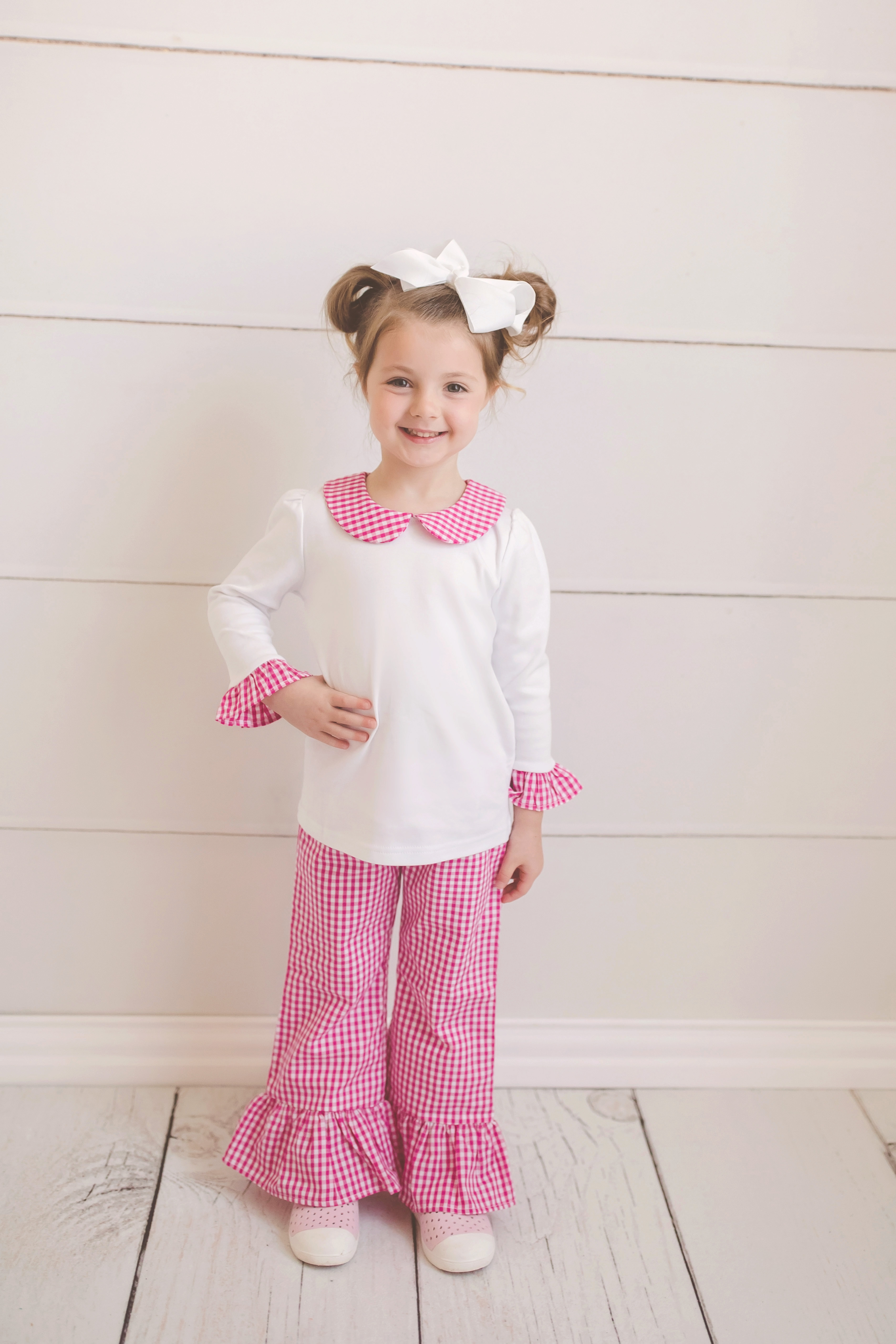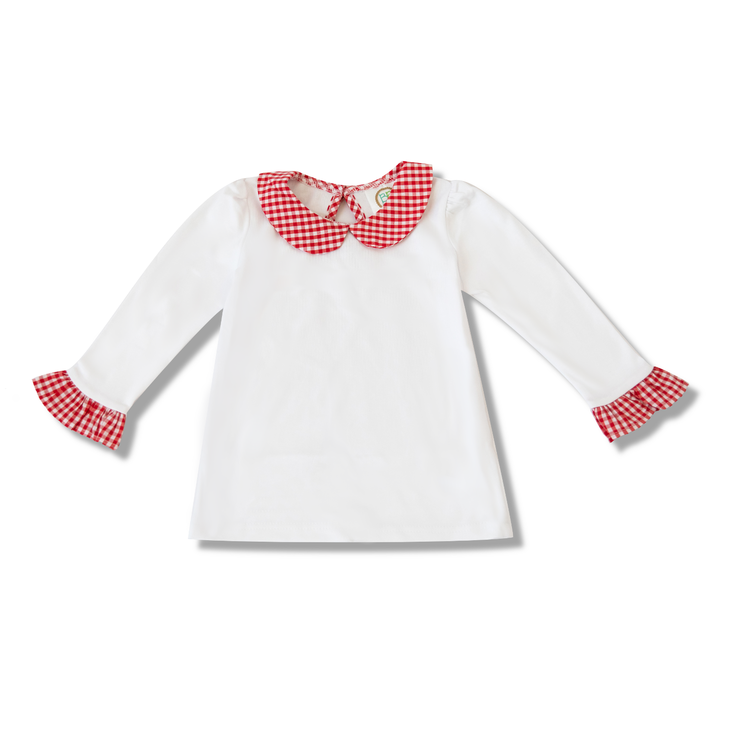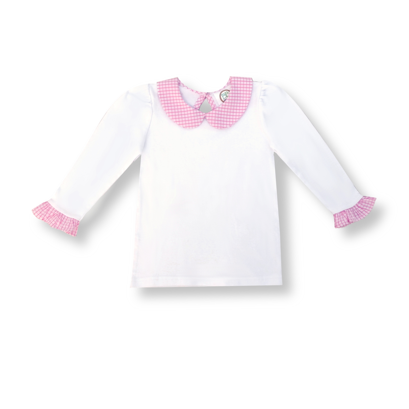 Our Girl's Long Sleeve Peter Pan Collar Tee is a classic boutique basic for your next embroidery or applique project! Pair with our Girl's Gingham Ruffle Pants!