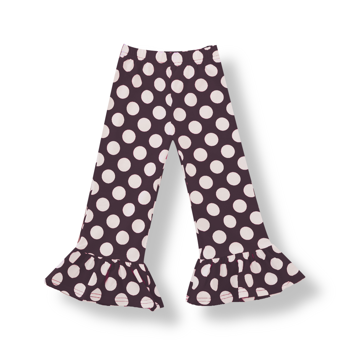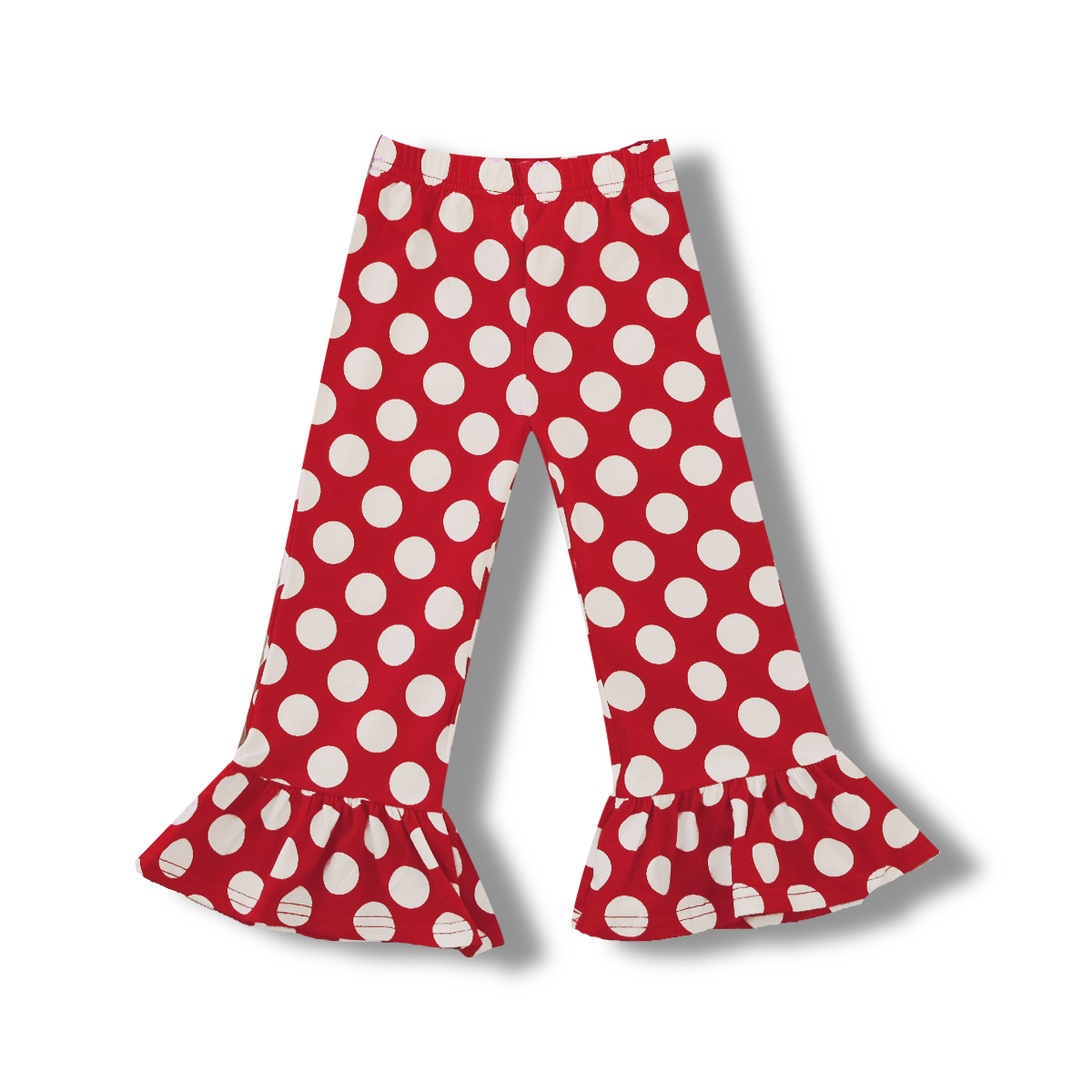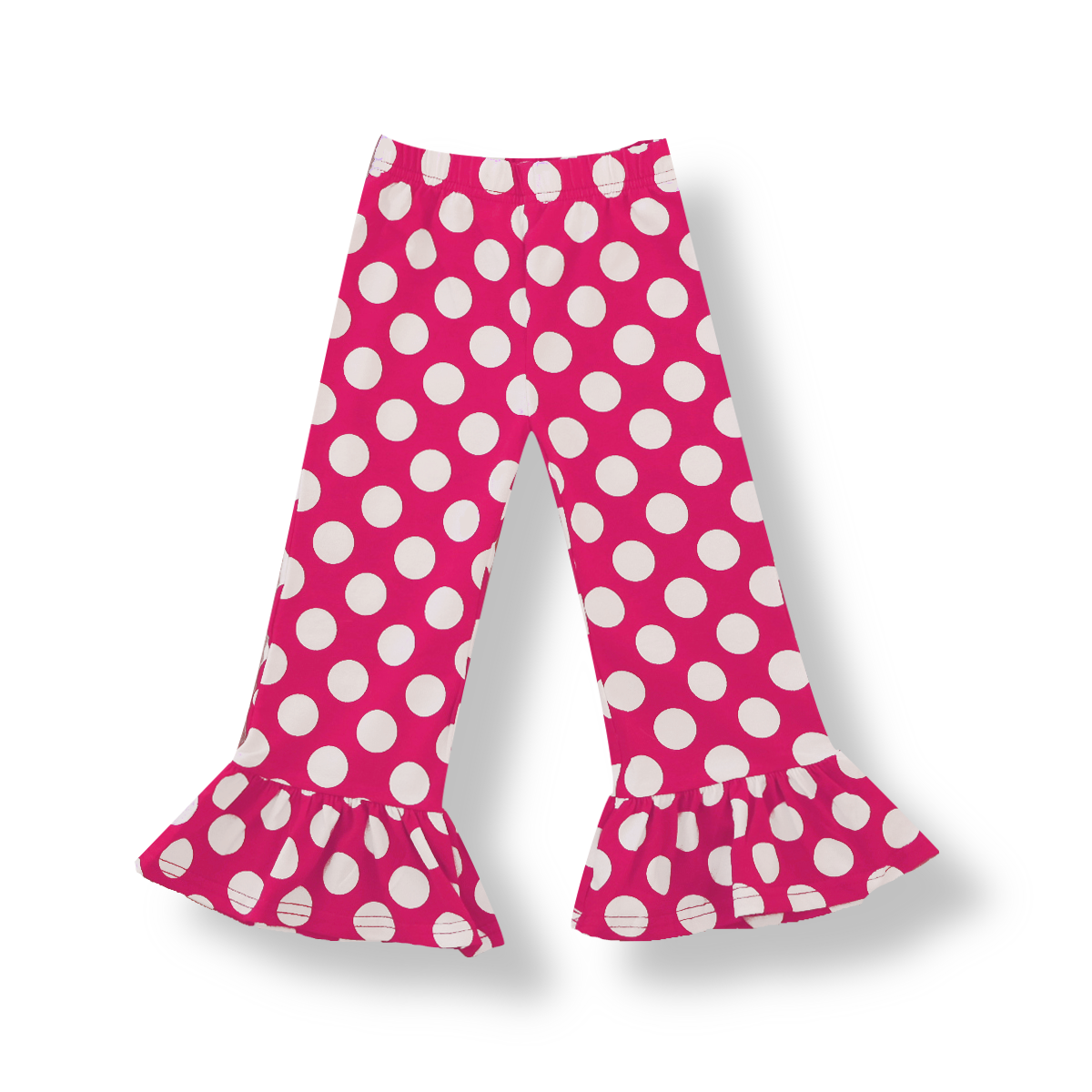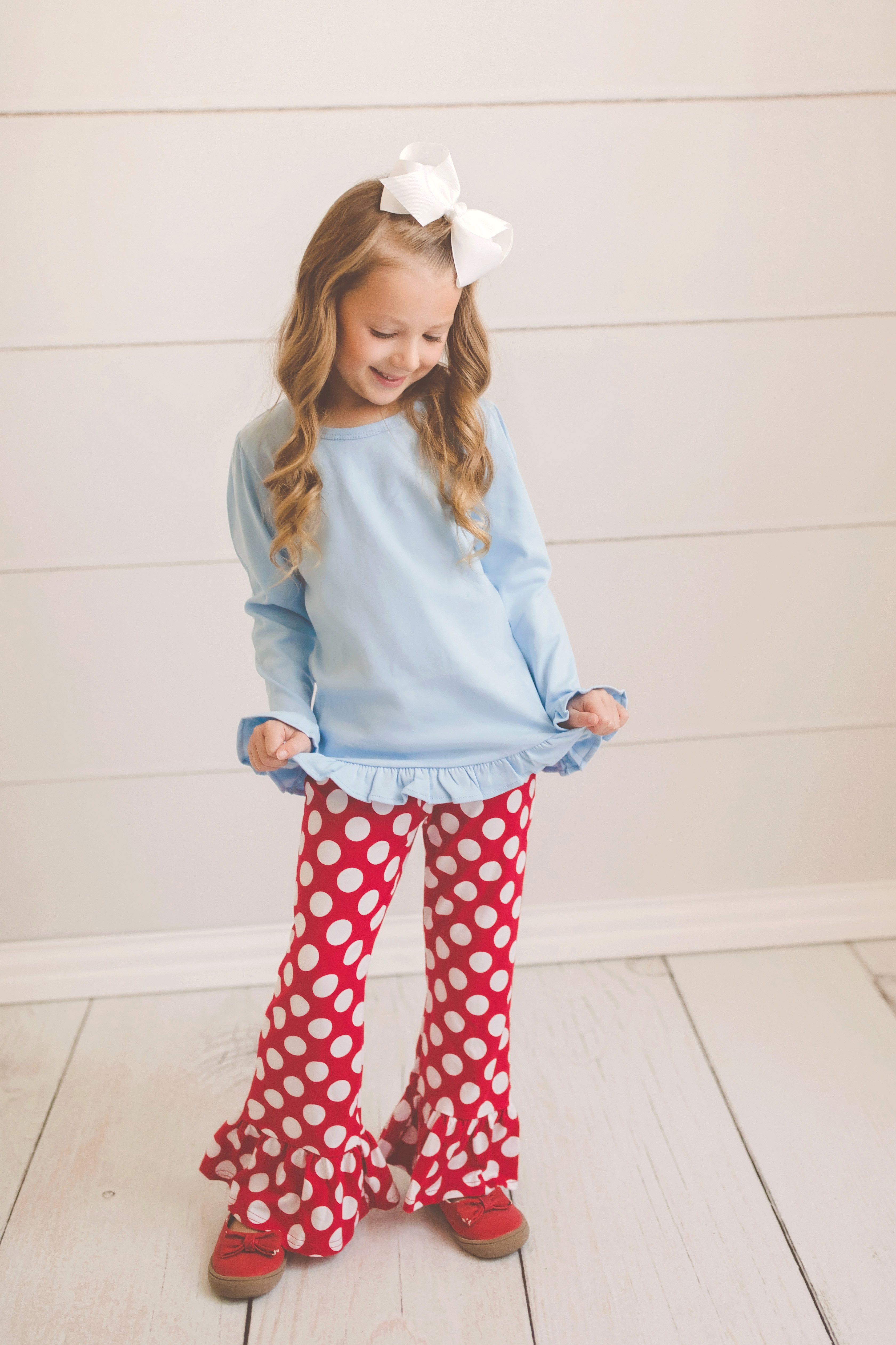 Our girl's polka dot ruffle pants pair perfectly with our embroidery blanks to make a full, ready made outfit!